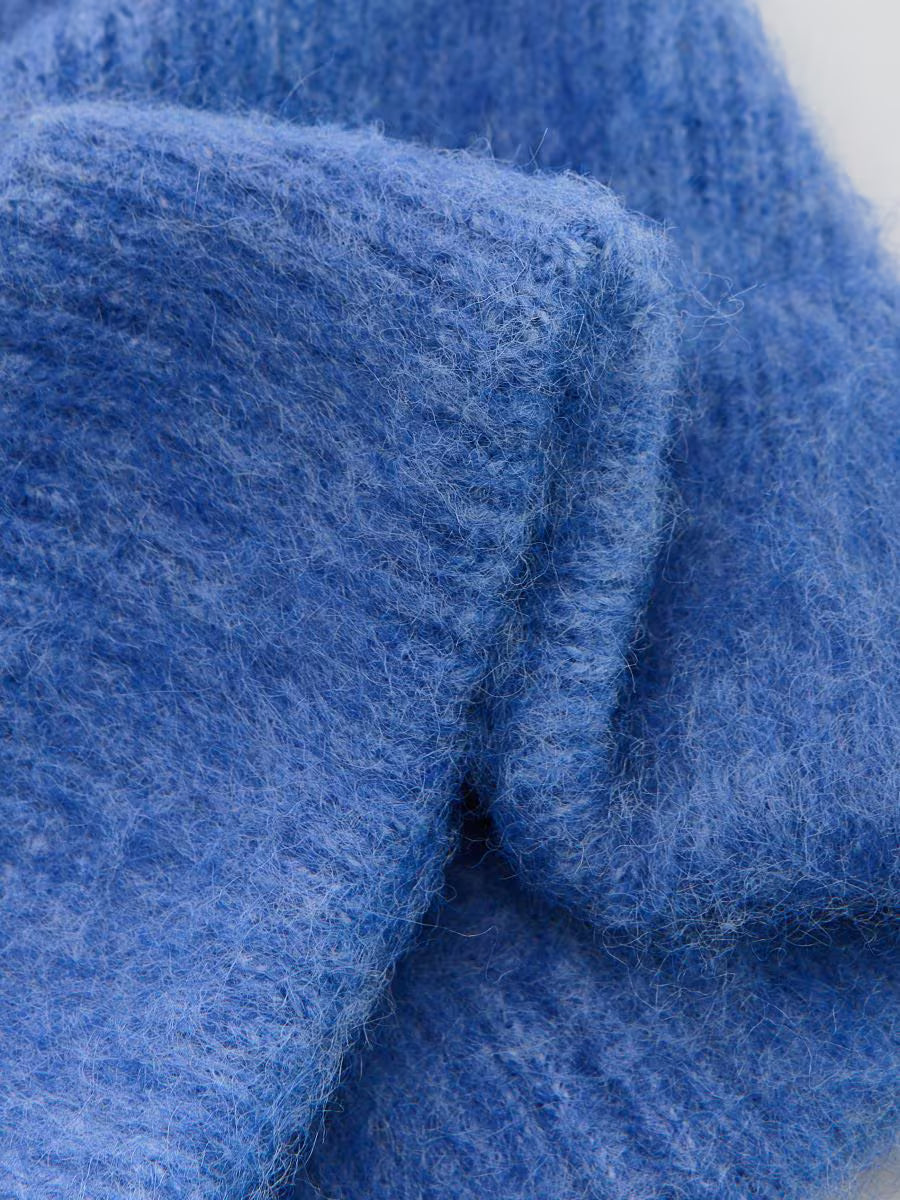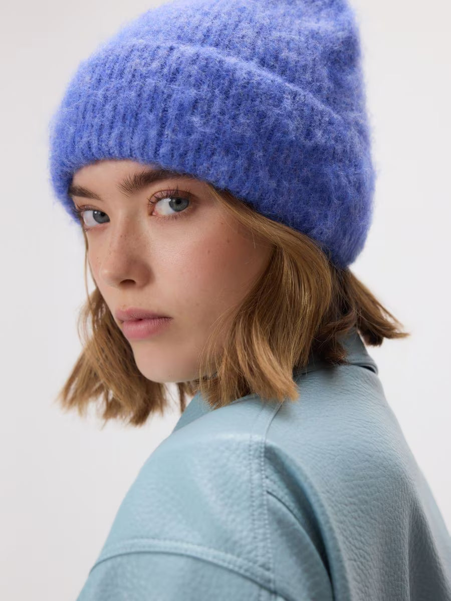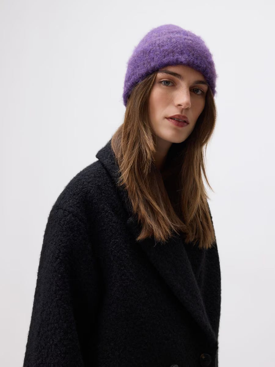 Stickad, elegant mössa i en djup lila nyans. Den luddiga strukturen ger en chic touch till din vinterlook.